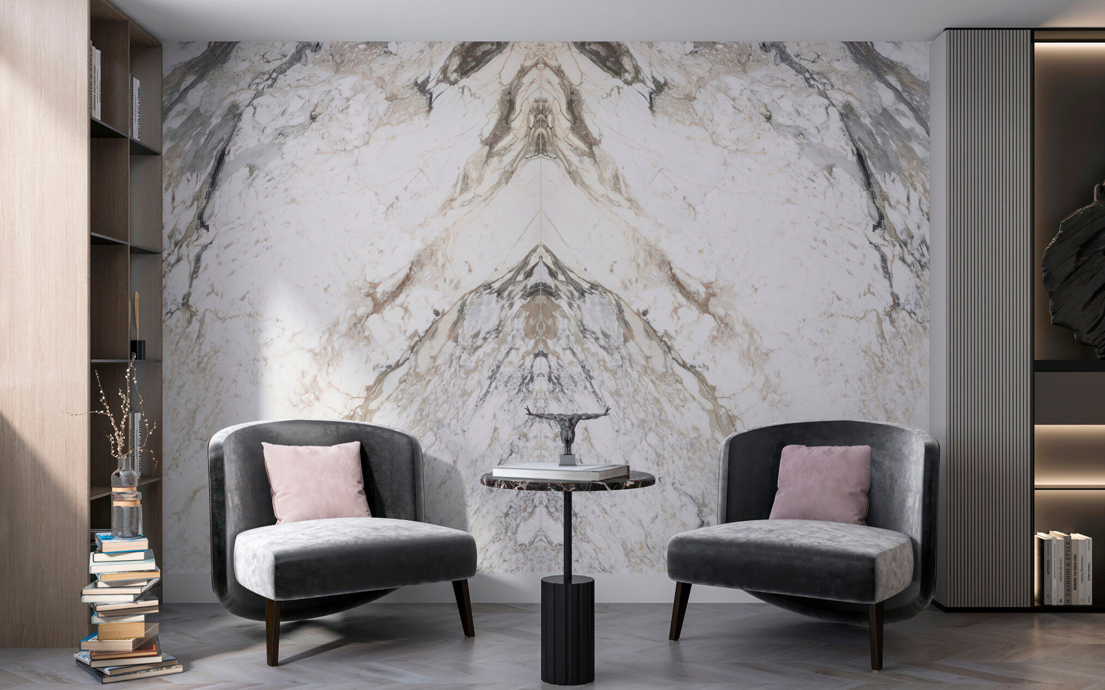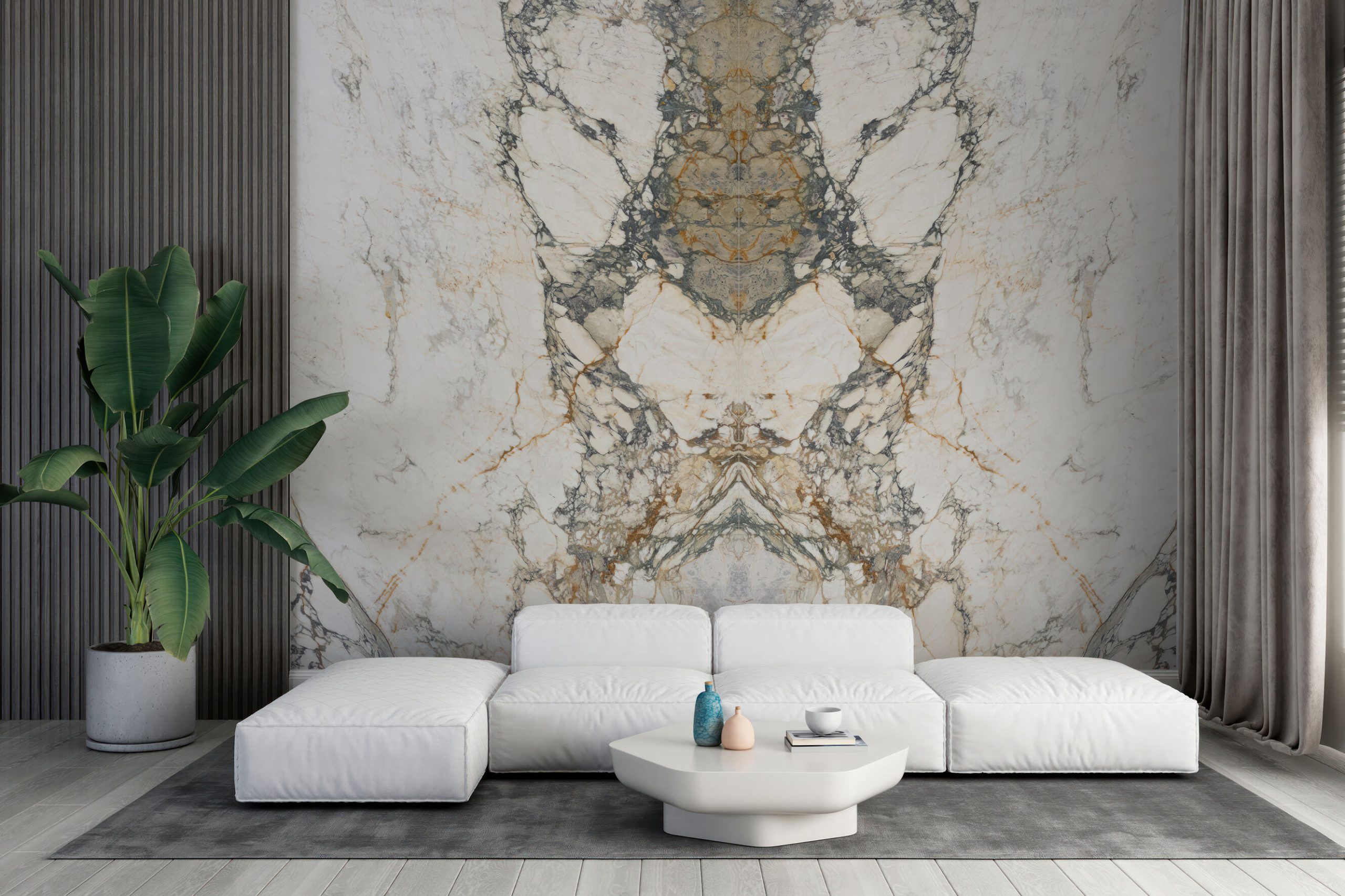 The book-matched installation allows for symmetrical, scenic surfaces, enhancing the natural design of the stone while ensuring refined aesthetic continuity.
