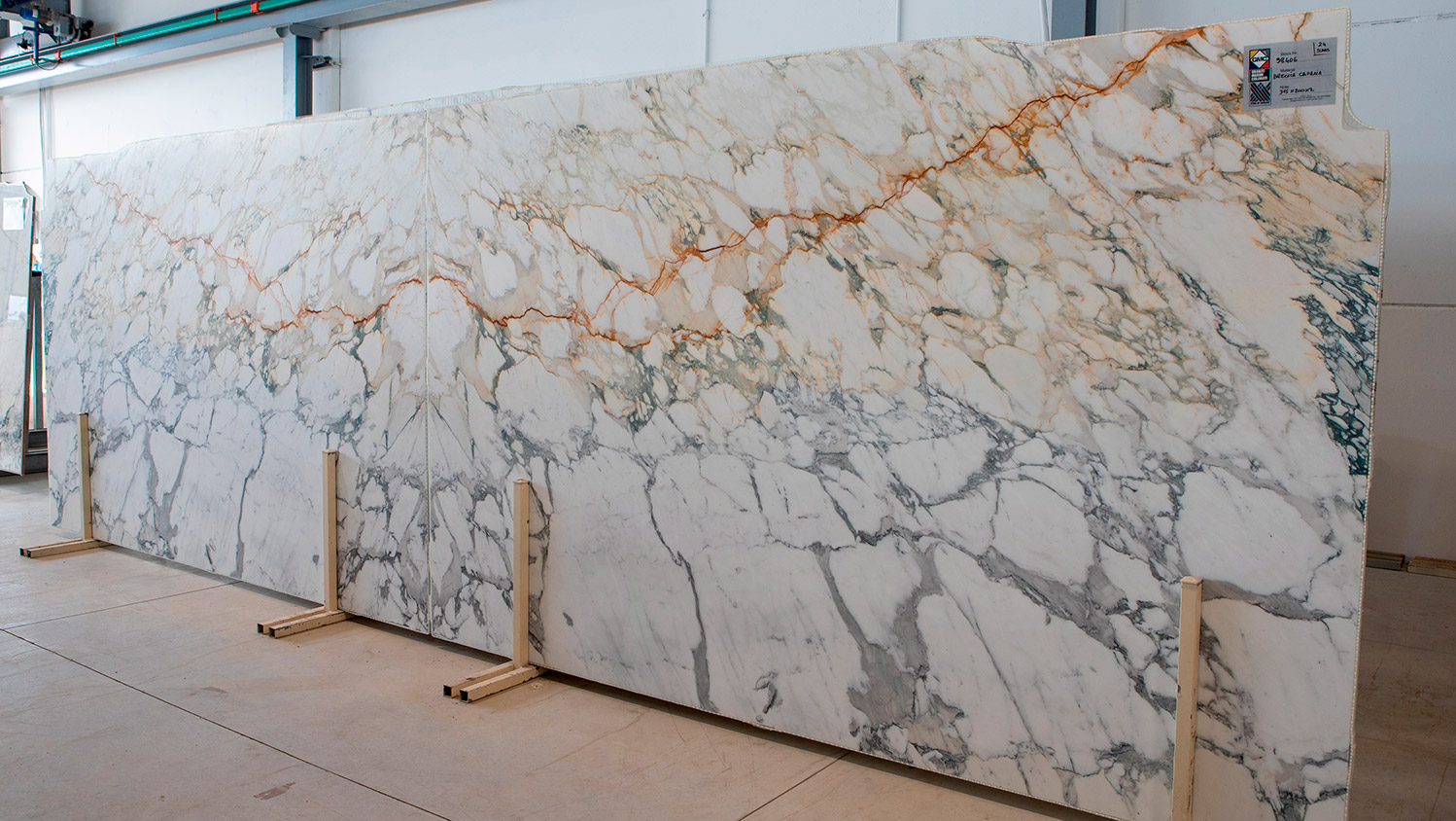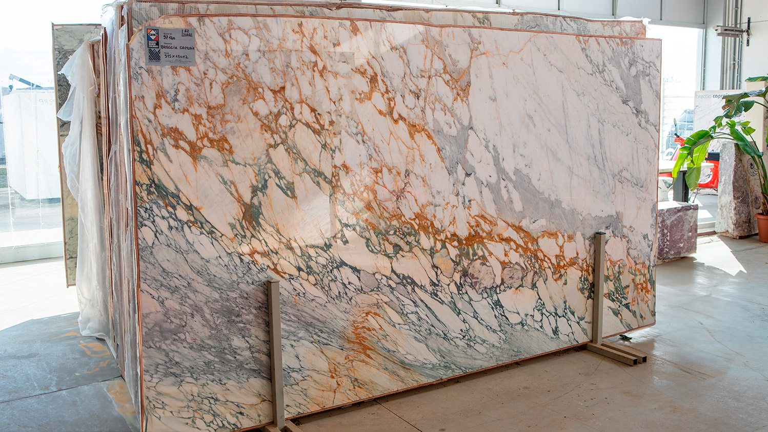 At the GMC showroom, visitors can view a wide selection of slabs, available both as single pieces and in book-matched layouts, designed to enhance the natural beauty of the stone’s veining.
