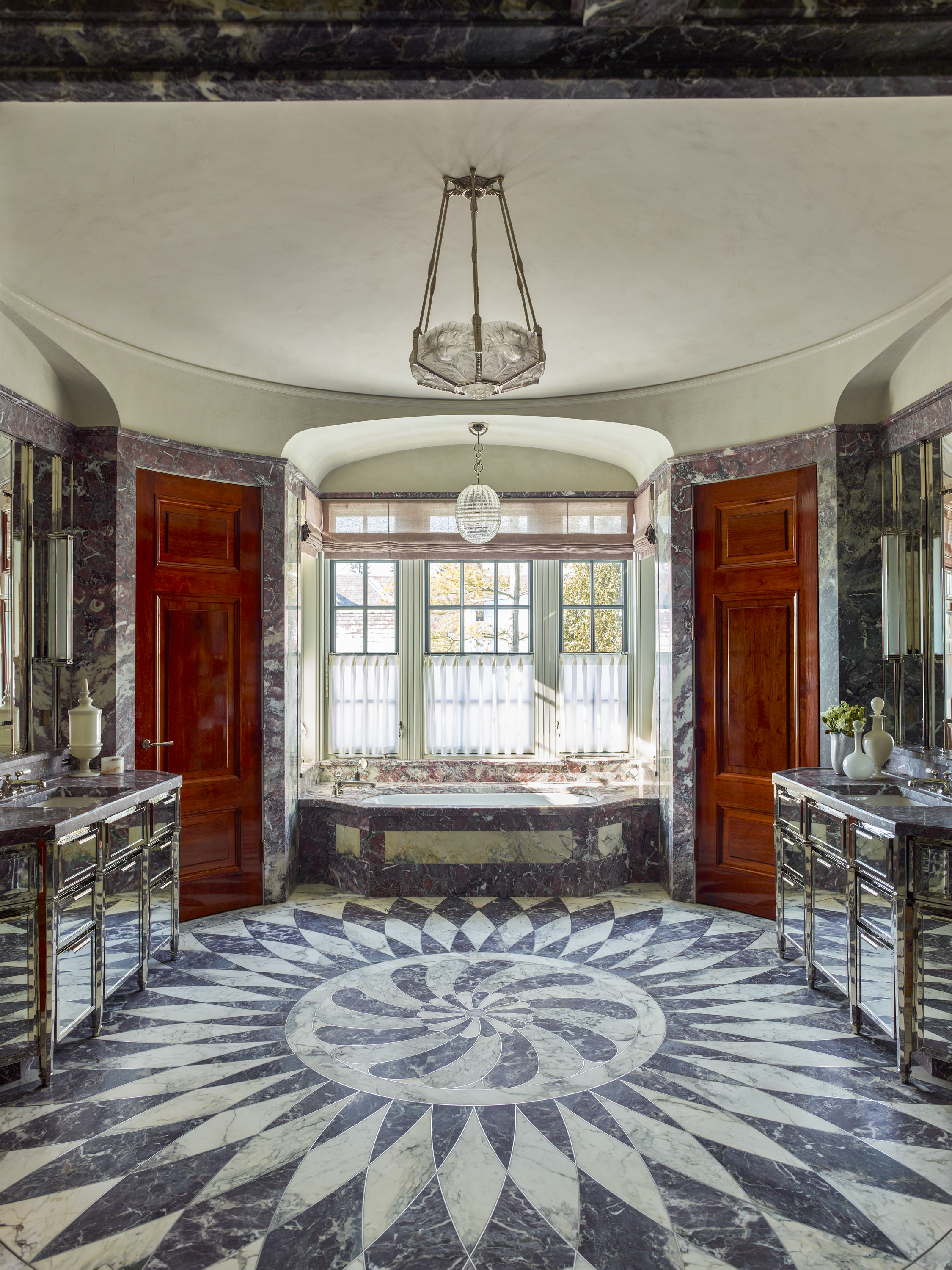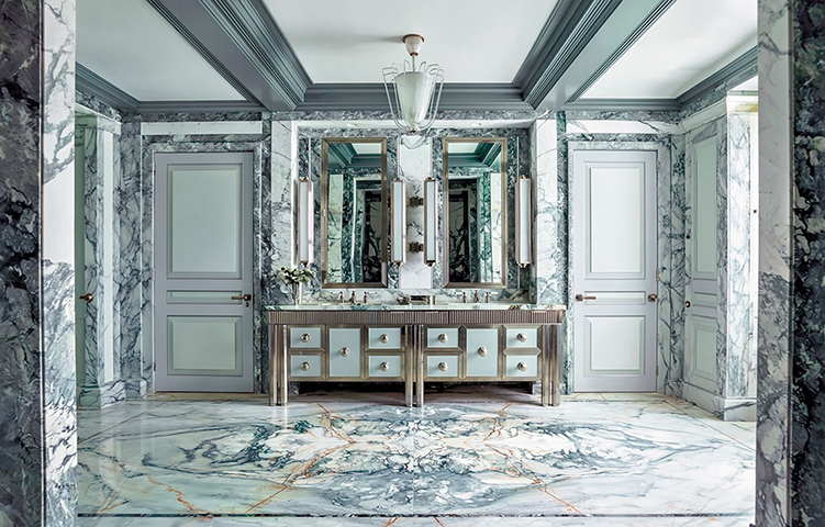 Tra le caratteristiche più distintive del progetto, il bagno padronale è rivestito in Breccia Capraia ®, la nostra pietra naturale caratterizzata da venature dinamiche e da un forte impatto visivo.