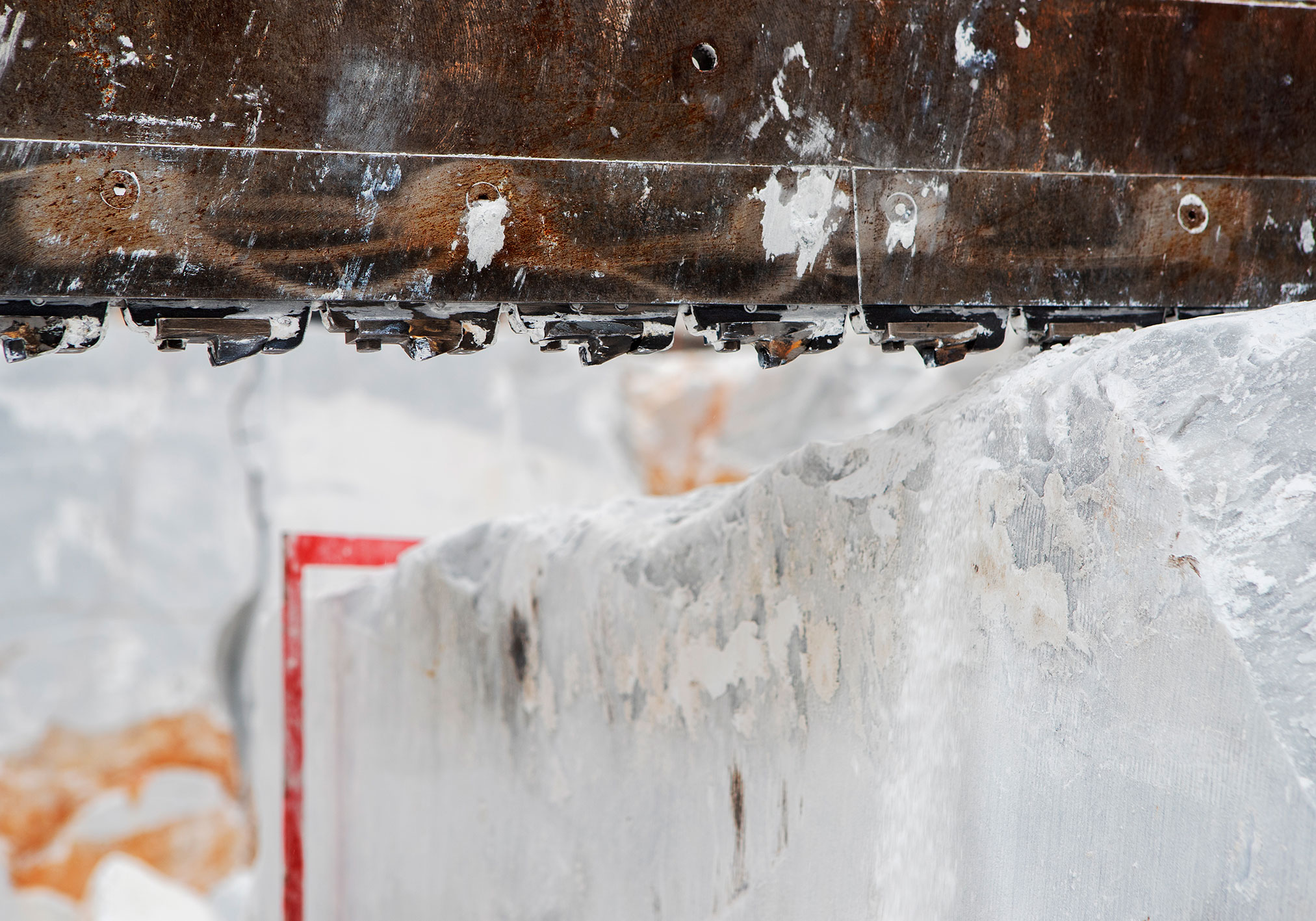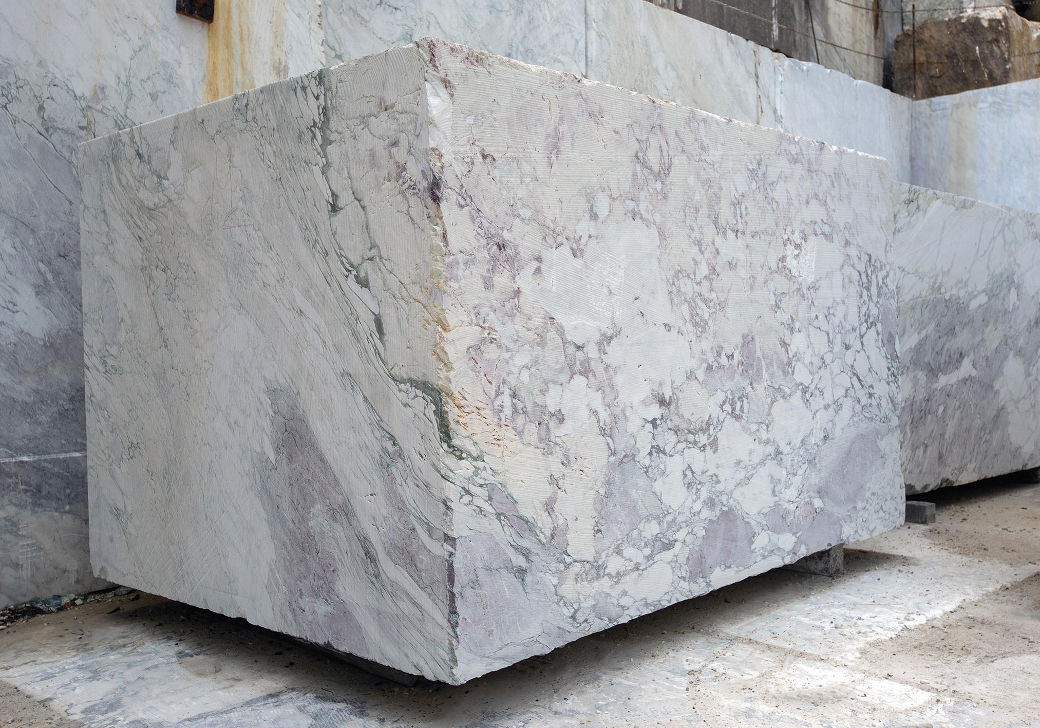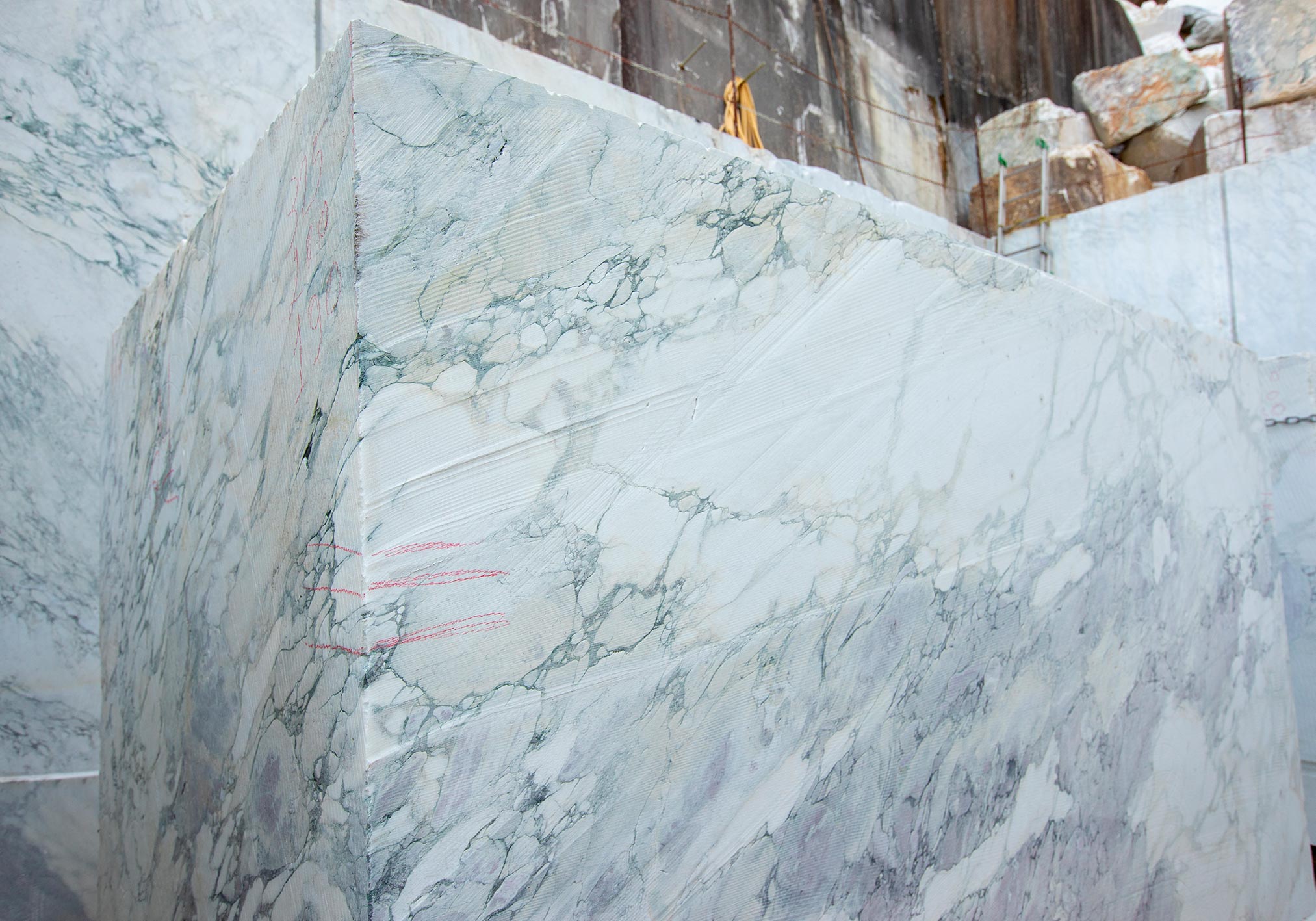 Il materiale estratto si distingue per il suo fondo bianco omogeneo e la struttura raffinata, caratteristiche che lo rendono particolarmente apprezzato per rivestimenti interni di pregio e per la scultura artistica.